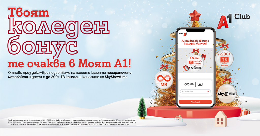 През декември А1 благодари на своите клиенти, като им предоставя специални коледни бонуси по случай празниците, които могат да активират през Моят А1. Абонатите на мобилна гласова услуга или мобилен интернет от телекома могат да се възползват от неограничени MB на максимална скорост, а ползвателите на телевизионни услуги – от достъп до над 200 телевизионни канала и двата ТВ канала на SkyShowtime.