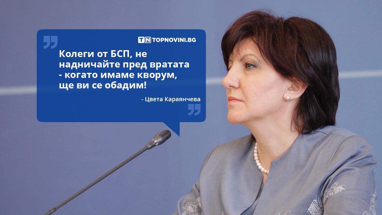 "Колеги от БСП, не надничайте пред вратата - когато имаме кворум, ще ви се обадим. Ако ви е интересно, влезте да се регистрирате!". Думи на председателя на парламента Цвета Караянчева по време на опитите за събиране на кворум за начало на днешното пленарно заседание.