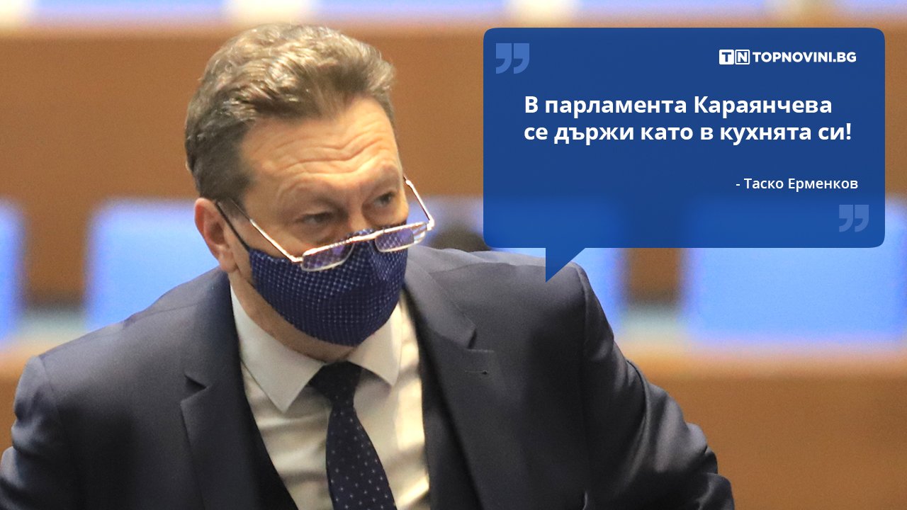 „Ако продължавате да се държите като във вашата лична кухня, мястото ви не е тук“. С тези думи депутатът от БСП Таско Ерменков се обърна към председателя на Народното събрание Цвета Караянчева, след като тя прекъсна изказване на депутат от левицата.