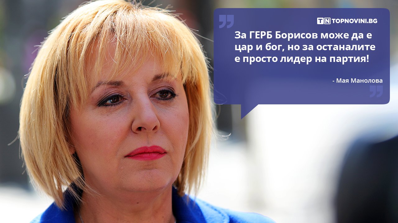 За ГЕРБ Борисов може да е цар и бог, но за останалите е просто лидер на една партия. Това заяви Мая Манолова от „Изправи се! Мутри вън!“ по време на консултациите при президента за състава на новата ЦИК. Думите ѝ са провокирани от решението на Борисов, ГЕРБ да оттегли кандидатурата на Красимир Ципов и да остави без председател колективния орган.