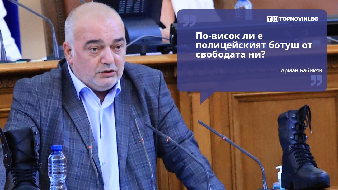 „Днес трябваше да разберем дали сме по-големи от полицейските ботуши или те са по-големи от нас. Обещахме на протеста миналата година, че ще стигнем докрай и няма да оставим нещата да се покрият. Слава Богу, поразкриха се! Злото е сторено, всички го видяхме. Ще направим два пъти по-голямо зло, ако замълчим и оставим нещата да отминат“, заяви Арман Бабикян от „Изправи се.БГ! Ние идваме“ от парламентарната трибуна, където постави чифт полицейски кубинки в края на изслушването на представители на МВР за полицейското насилие над протестиращи миналото лято.