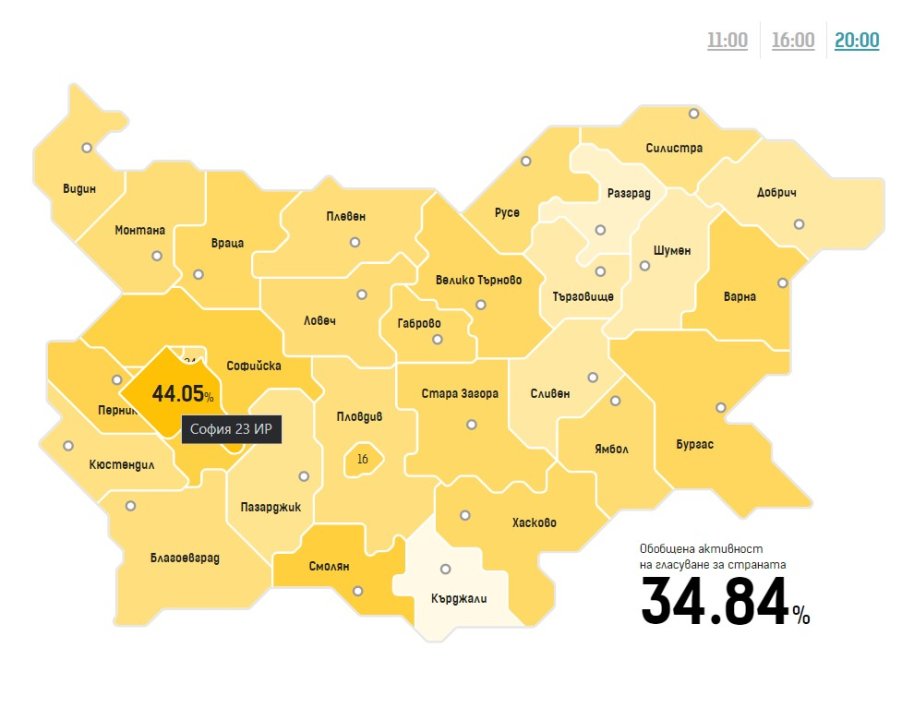 Най-висока е активността в 23 МИР София – 44.05%, а най-ниска в Кърджали 18.18%.