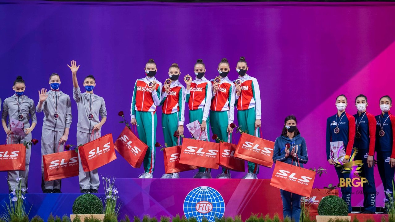 Родният ансамбъл, който постигна рекорден резултат в съчетанието с пет топки – 44.150, потегли с титла в многобоя. На композицията с обръчи и бухалки тимът постигна оценка от 40.200, а втори и трети се наредиха отборите на Азербайджан и Япония. В неделя картината не бе по-различна и българският тим, в състав Симона Дянкова, Мадлен Радуканова, Лаура Траатс, Стефани Кирякова и Ерика Зафирова, завоюва нови две златни отличия – на пет топки, и на три обръча и четири бухалки.