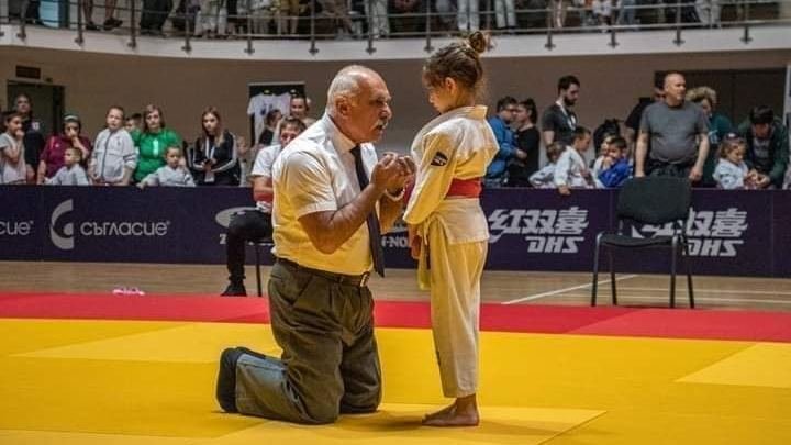 Съдията Иван Ганев падна на колене, за да обясни правилата на джудото на дете. За момиченцето турнирът „Панагюрище оупън“ бе първото състезание.