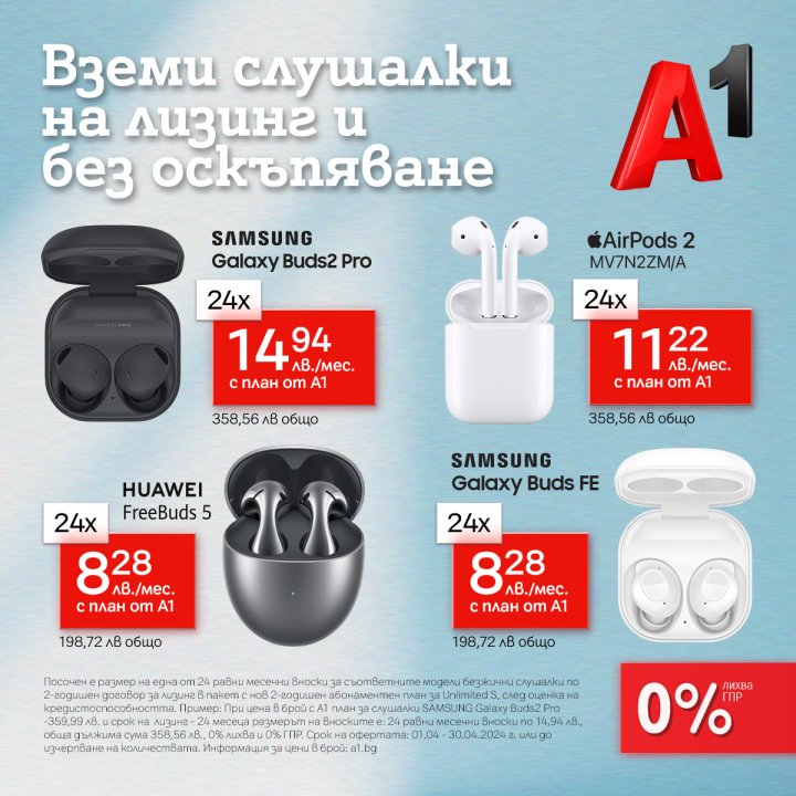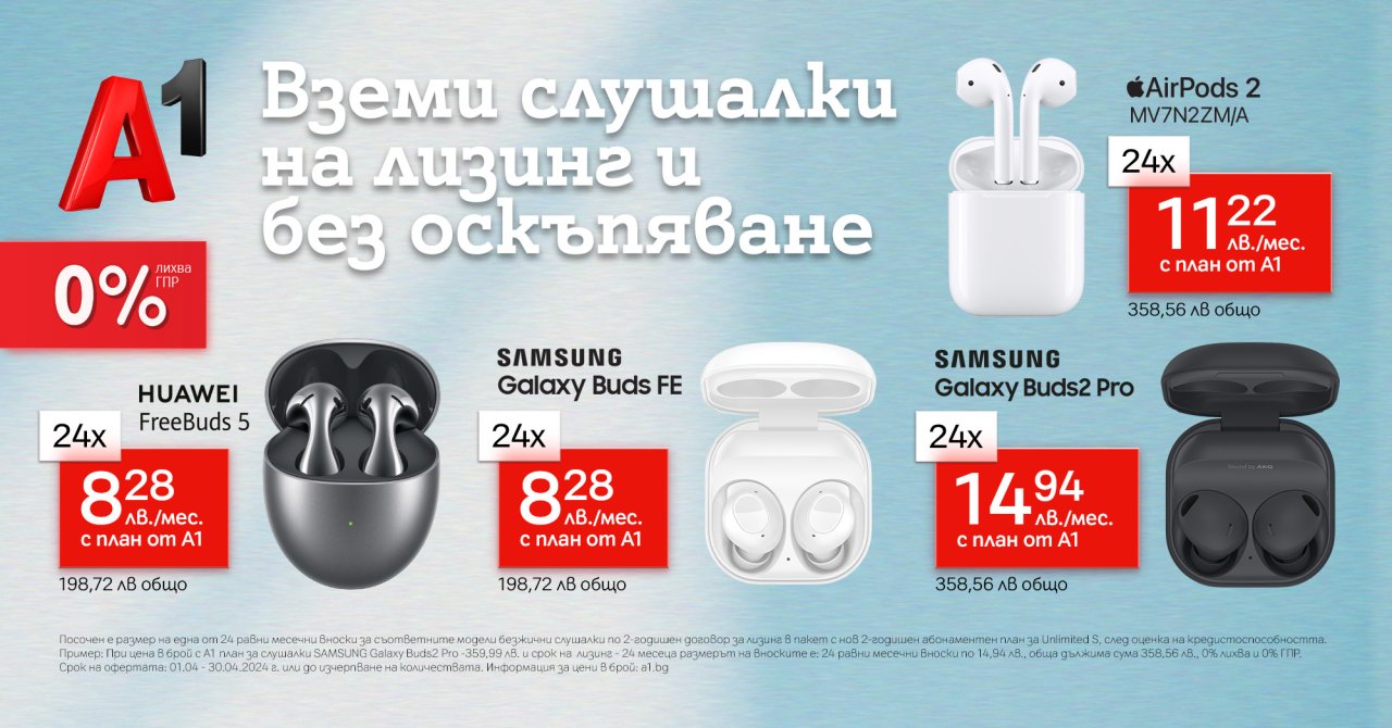 През април клиентите на А1 могат да вземат за себе си или близък нови безжични слушалки на лизинг без оскъпяване. Офертата важи за селекция слушалки от някои от водещите технологични компании - Samsung, Apple и Huawei. Моделите, между които клиентите на А1 могат да избират, са Samsung Galaxy Buds2 Pro, Apple AirPods 2 MV7N2ZM/A, Huawei FreeBuds 5 и Samsung Galaxy Buds FE.