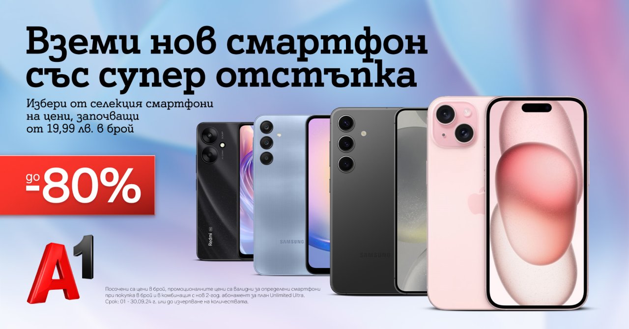 С настъпването на есенния сезон А1 дава старт на промоционална кампания на смартфони с до 80% отстъпка на цени, започващи от 19,99 лв. в брой с план Unlimited Ultra. Сред специално подбраната селекция от устройства попадат модели от портфолиото на Apple, Samsung, Xiaomi, Motorola и TCL. Офертата е валидна до 30 септември, като така потребителите на телекома ще имат възможността да се сдобият с едни от най-добрите смартфони на пазара на страхотни цени.