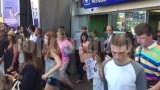 Пред аеропорта се събира тълпа, която очаква да влезе и да си вземе багажа.