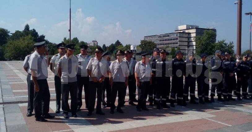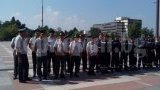 Групата, предвождана от началника си Георги Пармаков, рапортува на площад "Георги Измирлиев" пред главен комисар Николай Николов - директор на ГД "Пожарна безопасност и защита на населението"