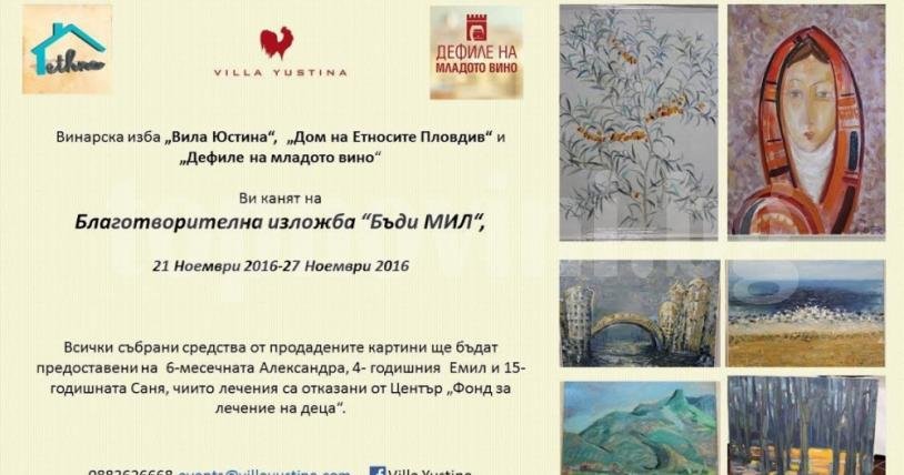 Изложбата “Бъди МИЛ” ще бъде открита от 18.00 ч. в Дома на етносите в Пловдив (бул.”Цар Борис III Обединител” 79). Специалният коктейл за колекционери и дарители е от 19.00 ч.