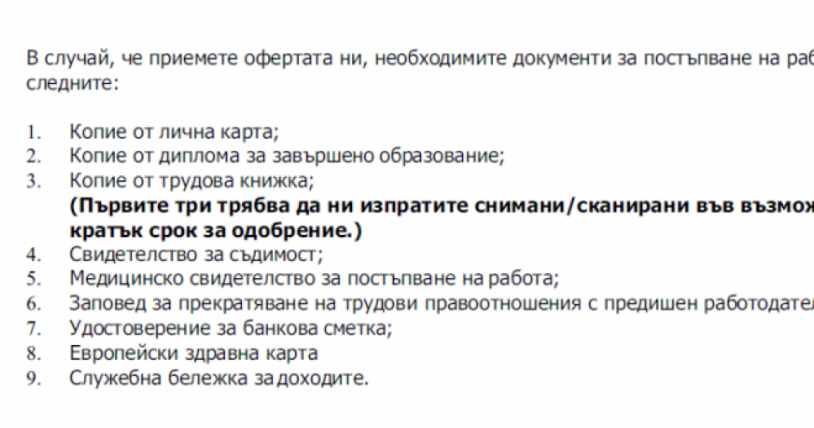 Във фалшивата обява възнаграждението, което се предлага, е почти двойно повече (между 1000 и 2400 лева), от това в истинската обява. Освен това, от кандидатите се изисква да изпратят по електронен път копия на личната карта, дипломата за завършено образование и трудовата книжка..