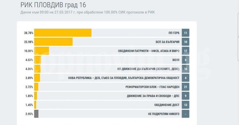 ГЕРБ печели в Пловдив град показват обработените на 100 процента протоколи от секционните избирателни комисии към 9.00 ч. За партията на Бойко Борисов са гласували 38.78% от хората.