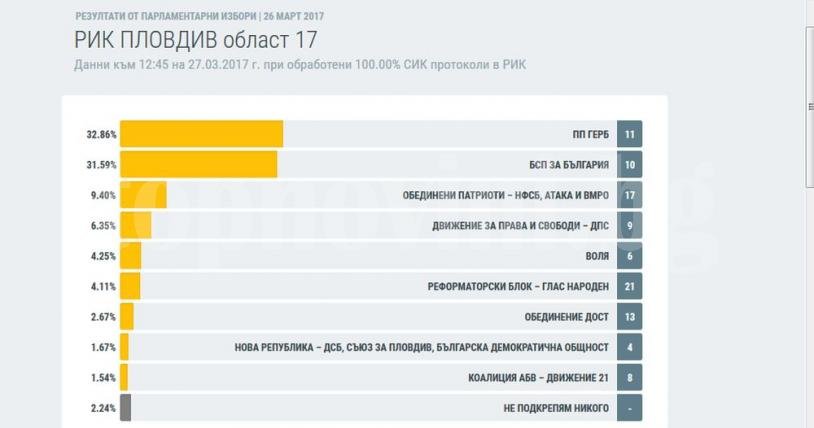Изключително оспорвана се оказа битката между ГЕРБ и БСП в Пловдив-област. Според всички обработени протоколи ГЕРБ получава 32.86% от гласовете на хората, а БСП - 31.59%.