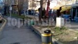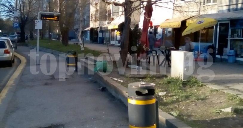На тротоара не се виждаха дори дупки, което означава, че навесът (разположен преди удара между двете кошчета за боклук - виж снимката) не е бил стабилно укрепен и циментиран в земята.