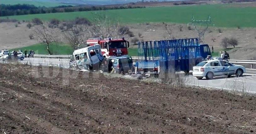 Бусът е превозвал препарати за растителна защити, които са разпилени по пътното платно.