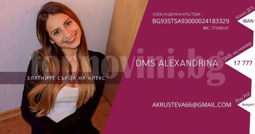 DMS-и могат да се пускат на номер 17 777 ALEKSANDRINA на цената от 1 лев. Желаещите да помогнат финансово могат да го направят на банкова сметка:
