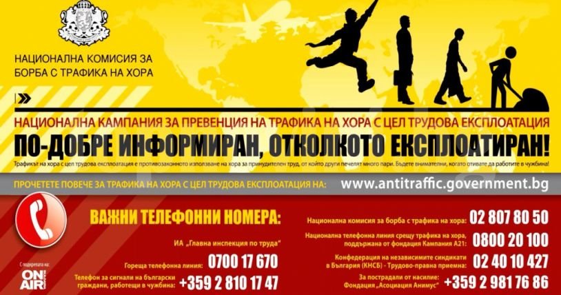 През месец май Местната комисия за борба с трафика на хора (МКБТХ) - Сливен, съвместно с Националната комисия за борба с трафика на хора, ще проведе информационна кампания за превенция на трафика на хора с цел трудова експлоатация под мотото „По-добре информиран, отколкото експлоатиран 2017”.