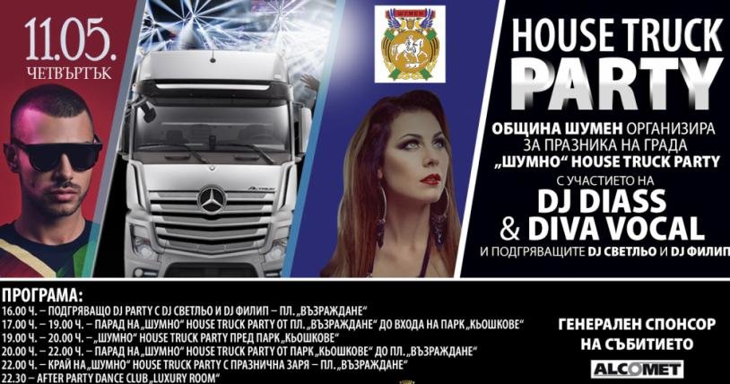 Община Шумен организира „ШУМНО“ HOUSE TRUCK PARTY по повод празника на Шумен, 11 май. Партито ще бъде с участието на DJ DIASS & DIVA VOCAL и подгряващите DJ SVETLIO И DJ FILIP, съобщиха от пресцентъра на Общината.