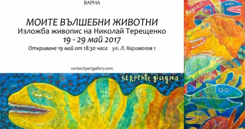 Половин час по-късно се открива изложбата живопис на Николай Терещенко „Моите вълшебни животни“. Авторът е заслужил художник на Русия, член-кореспондент на Руската художествена академия, син на великолепния майстор на живописта Николай Иванович Терещенко.Той е многостранно надарен човек и сферата на неговите интереси и занятия не се ограничава само в изобразителното изкуство. Николай Терещенко изпълнява свои авторски песни, пише пиеси, проза, стихове, сценарии, притежавайки несъмнен актьорски талант, излиза понякога и на професионалната театрална сцена.