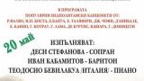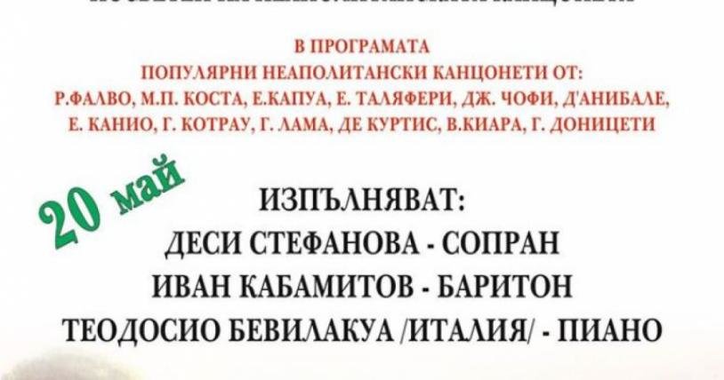 Два концерта привличат вниманието на ценителите на музиката. Вокално-камерният концерт „Kanta Napoli“ e посветен на неаполитанската канцонета, символ на музикална Италия по целия свят, изразяващ цялата палитра на човешката душевност – скърби и радости, страст, трепети и вълнения, наслада от земната и човешка красота, копнеж по родната земя…. Изпълнители са Деси Стефанова – сопран, Иван Кабамитов – баритон, на пианото е Теодосио Бевилакуа – Италия.