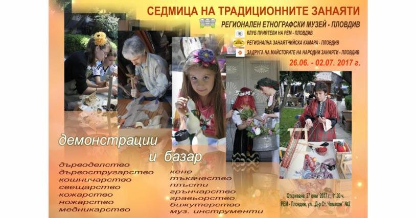 Срещата на занаятчии от цялата страна ще е както обикновено през последната седмица на месец юни 2017 г. в двора на Регионален етнографски музей – Пловдив. В двора на музея ще се съберат – дърворезбари, иконописци, ножари, оръжейници, медникари, бижутери, грънчари, кошничари, дървостругари, майстори на музикални инструменти, плетене на колани на кори, плъсти, кукли, рисувани яйца, стъклопис, майсторки на кене, плетиво и везба и др. В духа на добрата традиция през цялата седмица ще има демонстрации на различните занаяти.