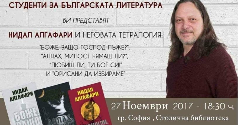 На 27 ноември 2017 г. -понеделник от 18:30 ч. в Литературния клуб на Столична библиотека ще бъде представена тетралогията на Нидал Алгафари "Боже, защо Господ лъже?", "Аллах, милост нямаш ли?", "Любиш ли, ти Бог си" и "Орисани да избираме" с участието на автора и „Студенти за българската литература“.