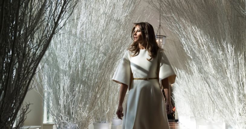 Мелания Тръмп, с помощта на кинорежисьора Тим Бъртън, е проектирала анти-коледен свят с бели клони, заставени срещу стената и хвърлящи зловещи сенки на тавана, водещи към стаята Източната градина, в която има традиционно коледно дърво, „изкъпано” в златна светлина.