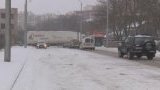 Заради силния снеговалеж в Хасково, ТИР блокира един от главните булеварди в града.