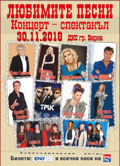 За първи път от много години насам част от най-обичаните български изпълнители ще пеят на една сцена във Варна. Концерт-спектакълът е на 30 ноември 2018 и в програмата му са включени любими български естрадни и популярни песни.
