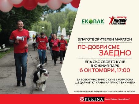 Благотворителният маратон ще стартира в 17:00 часа на входа на Южен парк от страната на бул. Витоша, а финалът е на площадката за кучета, изградена от Purina Bulgaria, където участниците ще очакват много награди, изненади и подаръци.