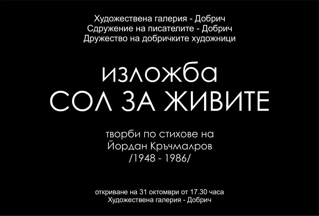 На 31 октомври от 17,30 ч. в две зали на Художествена галерия – Добрич се открива изложба „Сол за живите“. В нея участват 34 автори с 56 творби – рисунки и колажи, вдъхновени от поезията на Йордан Кръчмаров/1948-1986/. Изложбата е по повод 70 г. от рождението на добруджанския поет. Роден в с. Гурково, отишъл си на 38 години, той остави вълнуващо поетично творчество, а лириката му е оценявана като значимо национално литературно явление.