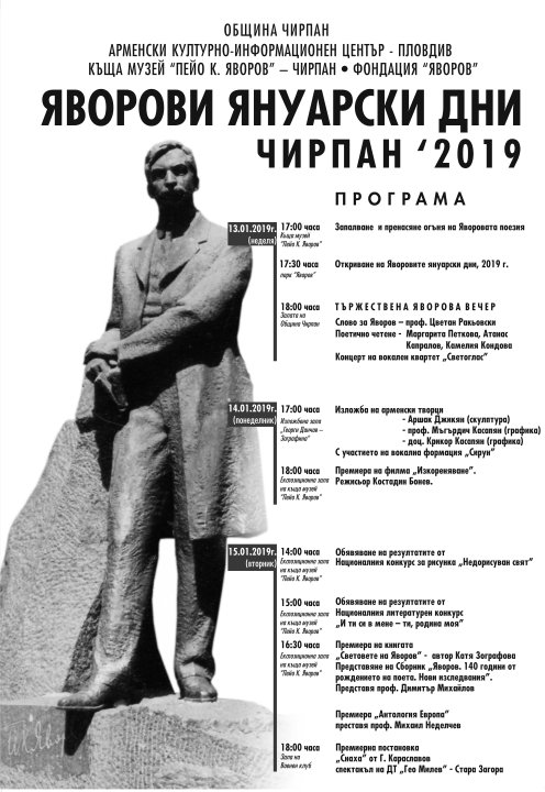 Традиционните Яворови януарски дни бяха открити тържествено днес в Чирпан със запалване на символичен огън на Яворовата поезия и факелно шествие до градския парк, съобщава БГНЕС. Проф. Димитър Михайлов от Великотърновския университет запали тази година огъня на Яворовата поезия. Така бяха открити 51-ите Яворови дни в Чирпан.