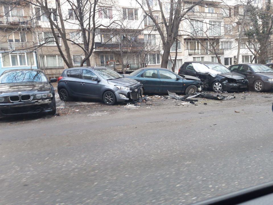В ранните часове на днешния ден е получен сигнал за инцидент на паркинг в района на ул. „Луи Айер”, а минути по-късно - за извършен грабеж и пострадал мъж. На място веднага били насочени полицейски екипи, които установили, че на паркинга са блъснати и увредени седем автомобила, съобщиха от пресцентъра на МВР. По-рано днес се появи снимка в групата "Забелязано в София " в социалната мрежа Facebook, която показа потрошените на паркинг автомобили. Първоначално се предполагаше, че нагъл шофьор е отговорен за нанасянето на щетите.