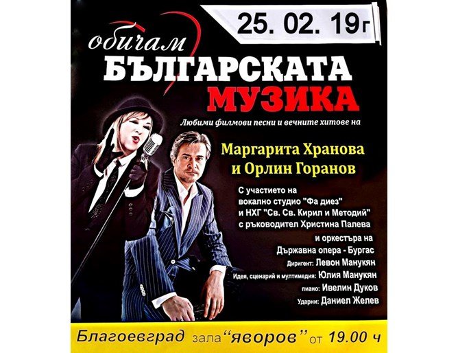 Концертът преминава под мотото "Обичам българската музика" и ще представи едни от вечните български хитове на музикалните легенди Маргарита Хранова и Орлин Горанов. Ще бъдат изпети още и любими филмови песни за жителите и гостите на Благоевград, за почитателите на златните хитове.