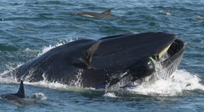 Преди инцидента Шимпф снимал миграцията на сардините, която освен китове привлича пингвини, тюлени, делфини, акули и морски птици, търсещи лесна плячка. Изведнъж се появил ивичест брайдов кит, отворил устата си и го погълнал с главата напред.