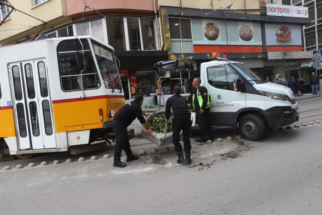 Наложи се екип да пристигне на място и да отстрани тежката кашпа от платното и трамвайните релси, съобщи БГНЕС.