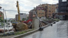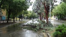 Вятърът събори огради на строеж, пречупено бе и иглолистно дърво на ул. "Иван Михайлов". Счупени клони има и на много места в целия град.