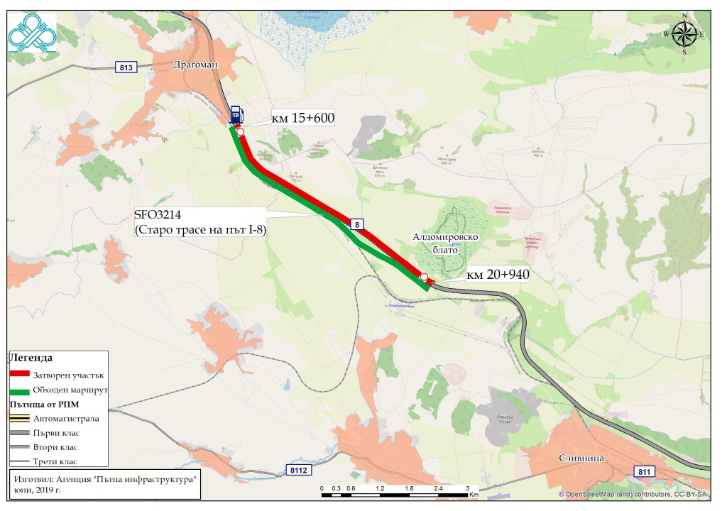 Идващите от ГКПП „Калотина“ към столицата ще се пренасочват на 300 м след газстанцията /“Сара“/, която е при изхода на гр. Драгоман в посока София, по новоизградена отбивка, водеща към старото трасе на път I-8 и ще се връщат обратно на първокласния път по новоизградена отбивка в района на надлеза, по който преминава общинския път за Алдомировското блато.