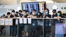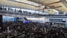 Международното летище в Хонконг отмени всички излитащи полети, след като четвърти ден антиправителствените демонстранти са блокирали сградата на терминала. Протестиращите раздават листовки и издигат плакати на над 10 езика в опит да информират пътниците за кризисната ситуация и исканията на демократичното движение.