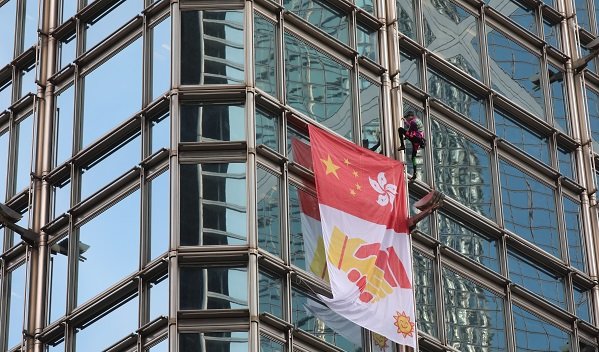 VIDEO - #HongKong : Le «Spiderman» français #AlainRobert grimpe sur un bâtiment à #HongKong dans un contexte de tensions politiques croissantes pour déployer une bannière montrant une poignée de main entre les emblèmes de la ville et de la #Chine." pic.twitter.com/APzg2hWytE