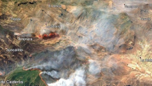 От детайлните снимки се придобива представа за сложния терен, погълнат от огнените стихии. Ясно се виждат няколкото дълги фронта на пожарите, както и димът, отнесен на стотици километри от бурните ветрове в района.