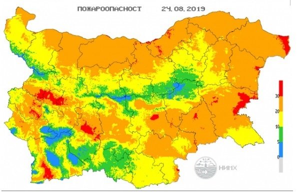 Индексът обхваща територии от областите София, София - град, Перник, Благоевград, Пазарджик, Стара Загора, Ямбол, Русе, Бургас, Варна и Добрич. Екстремалният индекс означава, че са възможни бързо разпространяващи се много силни пожари с въвличане на дървесните корони.