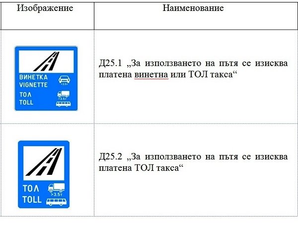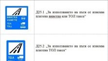 С нови пътни знаци ще се сигнализират и участъците от републиканската пътна мрежа, за които се изисква платена винетна или тол такса. Знак Д 25.1 ще информира водачите, че за използването на пътя се изисква платена винетна или тол такса, а знак Д25.2 ще е само за тол такса. Те ще се поставят на мястото, от което възниква задължението за плащане на такса.