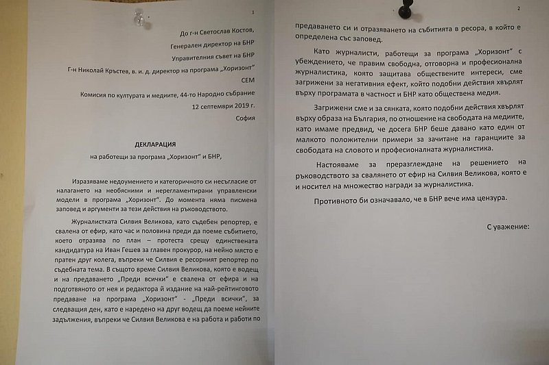 По-рано днес БНР свали от ефир водещата на "Преди всички" и дългогодишен съдебен репортер Силвия Великова. Тя подчерта, че към този момент няма предоставени официални мотиви защо е свалена от ефир.