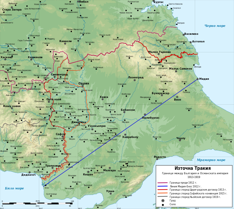 Съгласно Лондонския договор от май 1913 година, който слага край на Първата Балканска война, османската граница в Тракия е прокарана по линията между Мидия на Черно море и Енос на Егейско море.