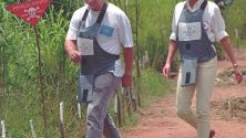 Принцът, в защитно облекло, премина през тесен разминиран коридор на активно минно поле. Той ще посети и участъка в град Уамбо, през който премина майка