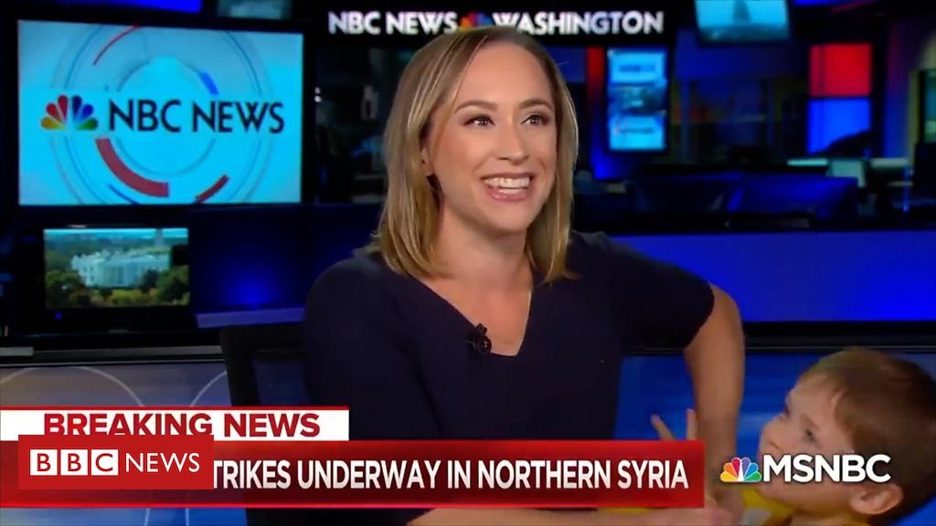 Кореспондентът на Пентагона на NBC Кортни Кубе говори за турските въздушни удари в Сирия, когато синът й се появява на живо на камерата.