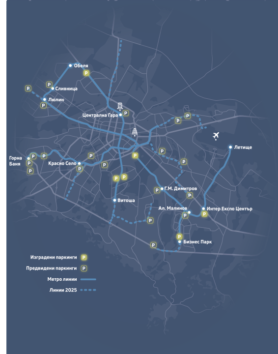 4 паркинга ще бъдат изградени до съществуващи метростанции – „Г. М. Димитров“, „Люлин“, „Младост“ до станция №18 и под бул. „Джеймс Баучер“. Други 3 паркинга се планират заедно с новите разширения на метрото - при Симеоновския лифт, в Студентски град и при новата жп спирка „Горна Баня“ с връзка с метростанцията до Околовръстния път.