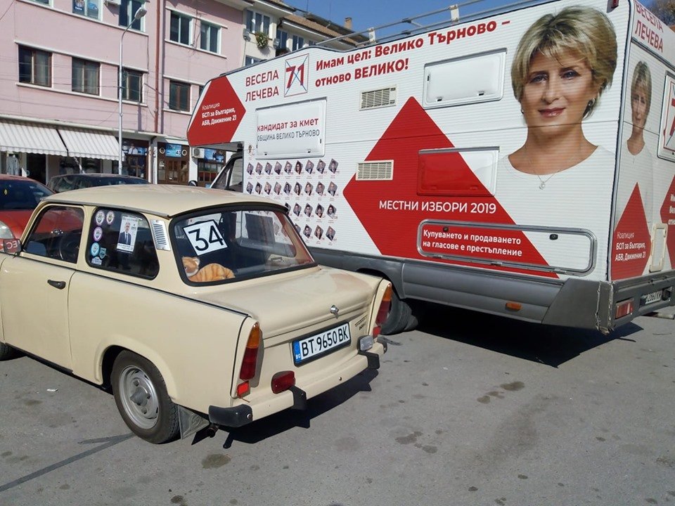Kaндидатът за кмет на Велико Търново от БСП - Весела Лечева скандализира хората с предизборния си бус, облепен с нейния лик и номер на бюлетина.