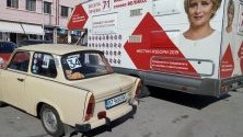 За разлика от кемпера на Лечева, трабантът на Михов само загатва, а не скандира и не се натрапва с двуметров лик на предизборен афиш, приличащ по-скоро на... несполучлив билборд.