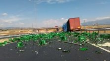 Друг камион разпиля каси с бира край село Бараково. Изведнъж ремаркето започнало да се тресе и товарът се изсипал, разказва шофьорът пред bTV. Карал е бавно.